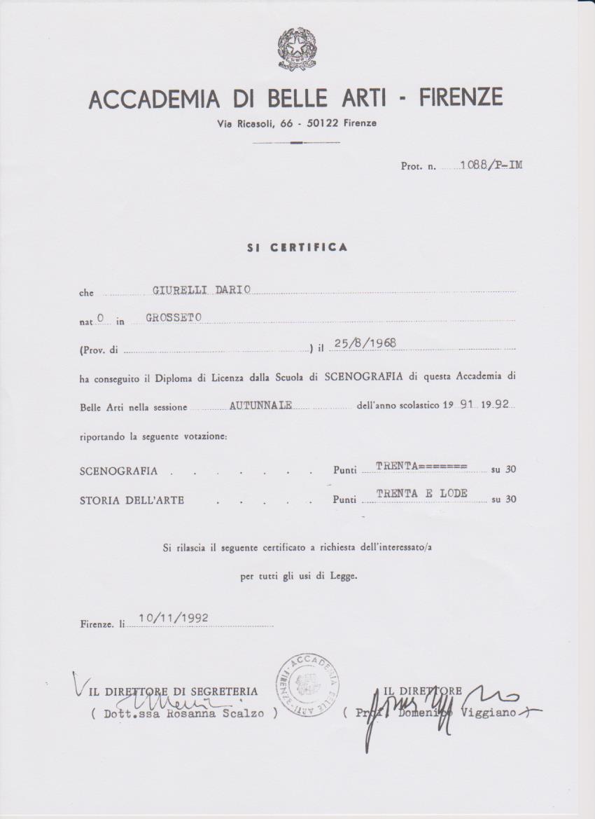 Diploma della Scuola di Scenografia dell'Accademia di Belle Arti di Firenze conseguito nella sessione autunnale dell' anno scolastico 1991-1992
